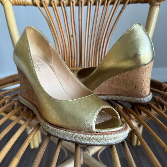 Cole Haan Gold Metallic Peep Toe Wedges With Cork Wedge Heel