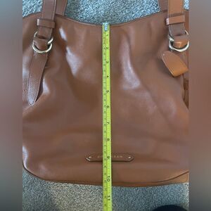 Cole Haan Leather Shoulder Bag two side pockets for cell phone and keys with zipper pockets on the front of those. Has a magnetic closure and two large pockets on the inside. Tons of room! Navy blue cloth interior very clean! Braided shoulder straps are not adjustable. Exterior has some small spots not sure what they are from. Bag has been cleaned And conditioned. Bottom and corners look good! Bag is very nice & Gently Used!