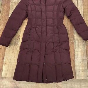 Cole Haan Signature Merlot Hooded Down & Feather Puffer Parka. Baffle-box quilting locks in the down-hybrid insulation of this puffy parka, fitted at the waist and inset with an extra stand-collar placket.
