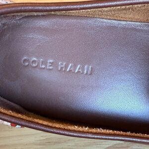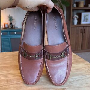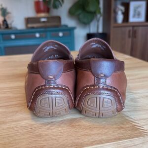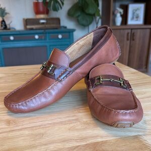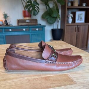 Elegant tan leather loafers featuring a gold accent. Perfect for versatile style and comfort.