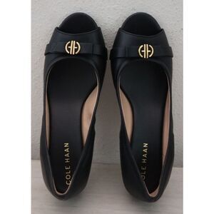Cole Haan W31648 Women's Sz 5.5B Black Leather Malta Peep Toe Wedges