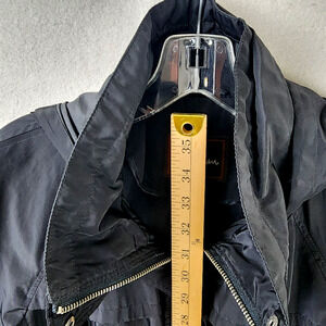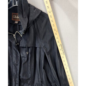 Stay dry and stylish with this Cole Haan women's black hooded raincoat in size large! This gently used raincoat is perfect for those rainy days when you want to stay protected from the elements without sacrificing your sense of style.