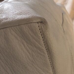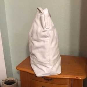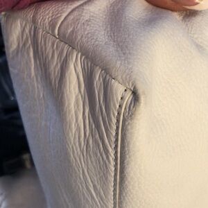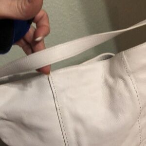 Beautiful snow white mixture of pebbled and glove leather exposed stitching all around short carrying handle snap closure gold tone hardware one large inside zip pocket when I deep pocket two large slip pockets lining