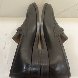 Elegant black leather loafers with a sleek design. Features a stylish metal accent. Ideal for formal and casual wear.