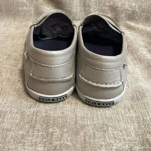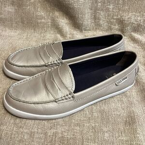 Very popular slip-on shoes by Cole Haan. Features a navy interior and silver exterior. Perfect for casual wear!