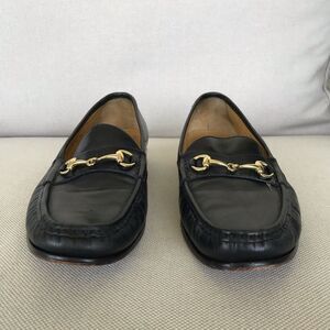 Sleek black leather loafers featuring elegant gold hardware. Ideal for versatile styling