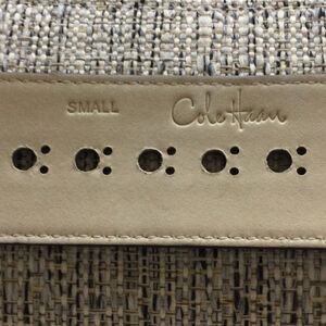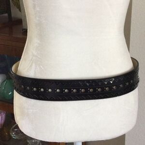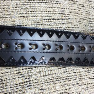Smooth & patent design - no marking as to if it is leather or not. Measures 38.5” x 2”.
