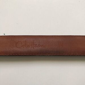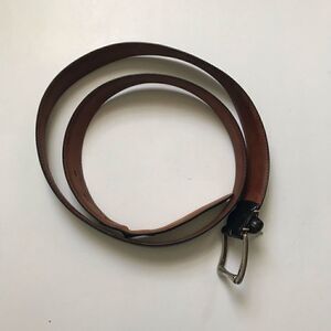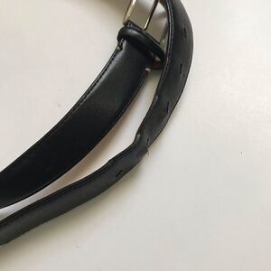 Black leather Cole Haan belt with silver buckle. Good used condition with some minor twisting of the leather and pulling at the belt holes. Total length 53”