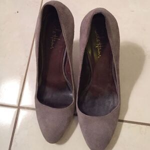 Beautiful gray suede heels, Brown wood 5" heel. If you have them cleaned they'll even look better than they do, have loads of life left in them