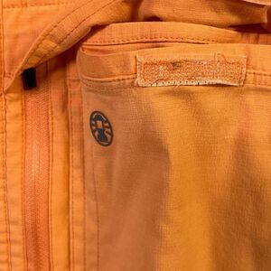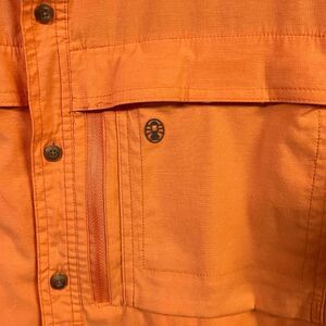 Vibrant orange button-down shirt. Short sleeves. Two front pockets. Perfect for casual outings.