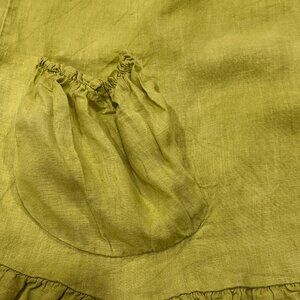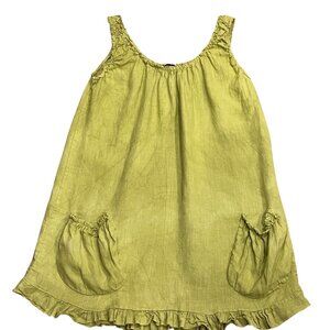 This A-line linen mini dress features a tank style with gathered shoulder straps, scoop neck, curved hem with ruffle, and stretch front puff pockets. Excellent condition, citron color, size large based on measurements