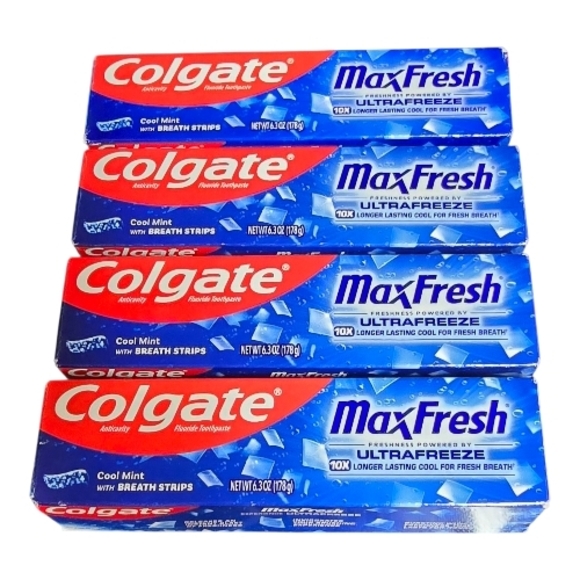 Colgate MaxFresh ultrafreeze toothpaste in Cool Mint with fresh breath strips.