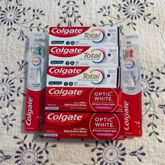 Colgate toothpaste and toothbrush set. Includes red and white packaging.