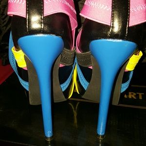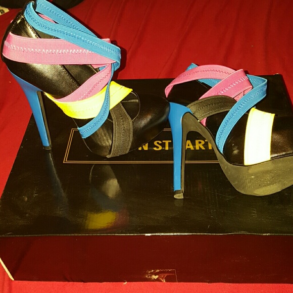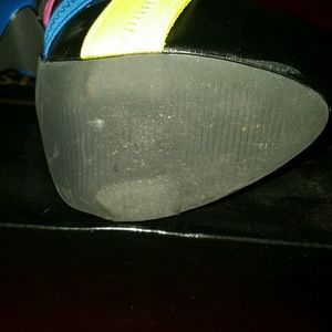 Black leather with blue, magenta and yellow straps, the heel is blue.. wore twice .. size 5 true to size