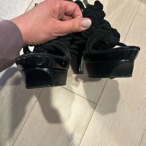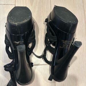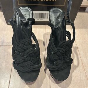 Colin Stuart Knotted Black Platform Heels. Step out in style with these elegant black platform heels. Perfect for any occasion, these shoes offer both comfort and sophistication. Size 7.5. Gently used has some scuffs and markings. WILL NOT FIND THESE AGAIN - no longer producing. Has ankle closure.