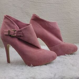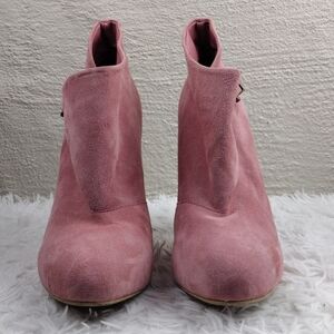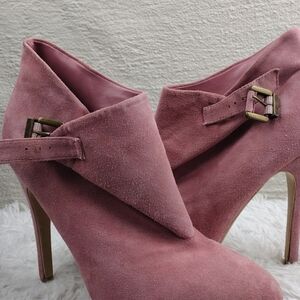 Colin Stuart Pink Suede Brass Buckled Upper Almond Toe Stiletto Heel Bootie