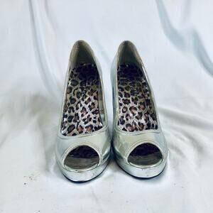 Stiletto heel silver mirrored peep toe pumps by Colin Stuart in fairly good preowned condition. No dlamage, but lots of small scratches. Especially so on inner sides. Please see all images.