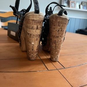 Super cute platforms! Size 8. Genuine leather upper in black. I normally wear an 8 1/2 but these fit fine and are actually pretty comfortable. Only worn a couple times. There are a few nicks in the cork but not real noticeable. I believe I paid $100 back in the 90’s for these beauties!