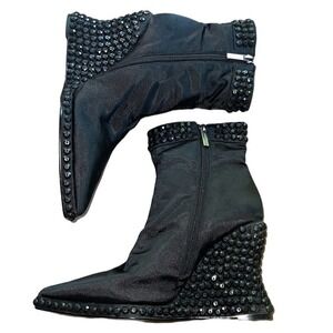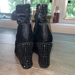 Colin Stuart Wedge Boot Black Satin Beaded Heel Sole Cuff Pointed Toe Size 7.5