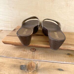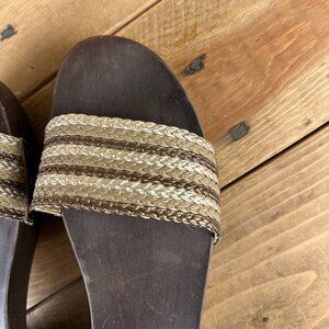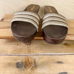 Colin Stuart Wood Bottoms Clogs Sandals Leather 7.5 Gold Brown Platform