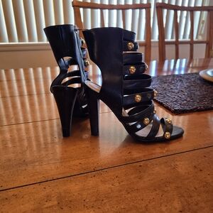 Worn a handful of times- Black 3 1/2 in heel leather with gold and medal accent gladiator straps, leather wrap heel and gold zip instep closure for support. Size 7. Comes with plastic shoe storage box.