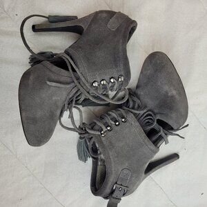 Colin Stuart gray suede booties fringe leather ties tassels stilettos boho 6.5