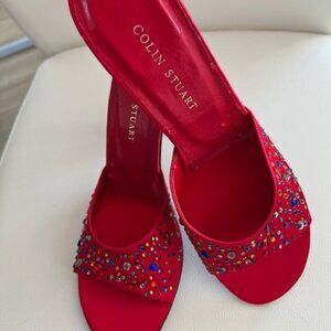 Stunning red high heels by Colin Stuart, size 8.5. These shoes feature an open-toe design with vibrant, multicolored rhinestones for a glamorous look. Heel height is approximately 4 inches.