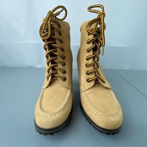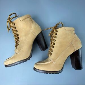 Colin Stuart High Block Heels, Cross Lace Up Ankle Boots, Tan Color, Combat/Work Boot Timberland Style, 4” Heel. Leather upper material. 2175319-041