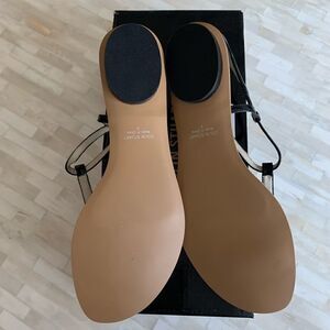 New in box never worn. Tan shoe with black patent leather ankle and thong/ t strap straps. Small heel about 1/2 inch. Very neutral will go with just about anything including shorts dresses and pants.