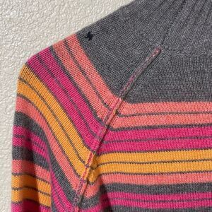 Stay cozy and stylish with this chic striped sweater. Featuring a blend of gray, pink, and orange, this piece is perfect for any casual outing. Enjoy the comfort and warmth it brings to your wardrobe.