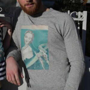 Original collage design grey longsleeve dark grey pullover sweatshirt by Brooklyn artist Claire Lorenzo
