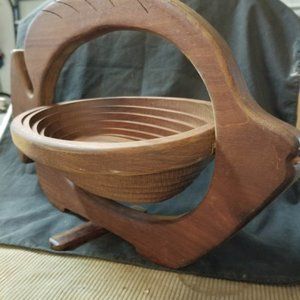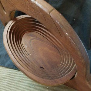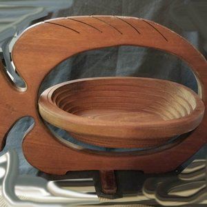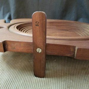Collapsible hard wood Fish basket marked SD on the side. Good condition, just needs some cleaning up. Size flat is 15 1/2" x 10 1/4". When opened and standing it is about 10 1/2". The basket section inside can rotate, see pics. It is marked SD on the rotating wood piece and SD under that piece.