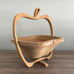 Cute and creative apple shaped wooden basket. Approximately 10" x 10" (wide and tall) Stand folds out on the bottom, twist to let basket fall under the handle and stem. Collapses into a single layer.