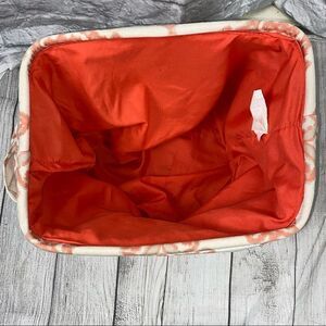 Collapsible print canvas covered storage cube with metal rim and side handles. Small spot as shown on outside and inside of cube as shown in picture.