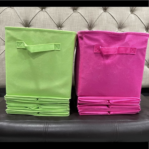 4 Pink and 4 Kiwi bins 1 bin has a lil pilling (see photo) but it has no bearing on its use or look. They are about 10.5”x 10.5” Non smoking home. Great condition, no stains. Willing to divide them up. All 8 for $30 or 4 for $15