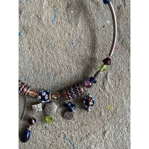 Collar Necklace Glass Beads Metallic Silver Tone Artisan Blue Brown Green. Condition is Pre-owned. Shipped with USPS Ground Advantage.