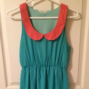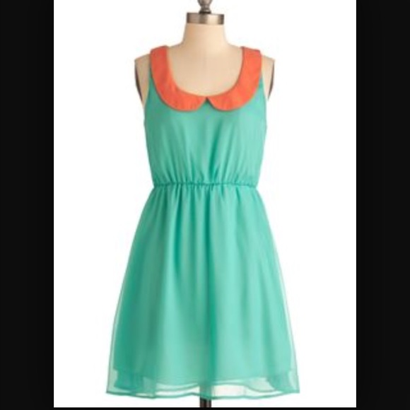 Very cute and gently worn Peter Pan collar dress from ModCloth. Size Small 33.2 inches in length, size runs true to tag. ✨There is a small beige foundation stain on the inside of the back of the dress but it isn't seen when worn. ✨ "Collar Palette Dress - Mid-length, Green, Orange, Peter Pan Collar, Sheath / Shift, Spring, Casual, Sleeveless, Pastel, Sheer, Mint"