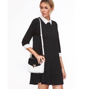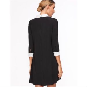 Collared black dress with zipper in the back and cuffed three-quarter length sleeves.