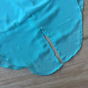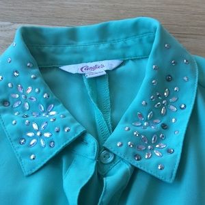 Teal color. Gently worn. Collar has silver jewels. Buttons all the way up and has sleeves that can be buttoned or unbuttoned. Has a few small specks on the front (pictured). They might come out in the wash! The bottom of the shirt is a sheer material and the back has a slit