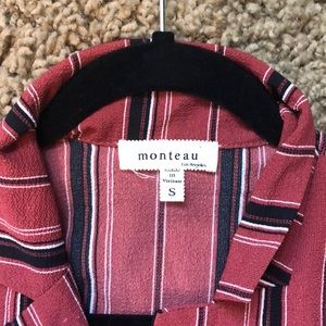 The brand is Monteau. It is a collared shirt. It is made with 98% polyester and 2% spandex. It comes with adorable tie and the bottom and is a pinkish/brick red with black and white stripes. 😄