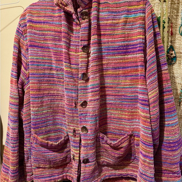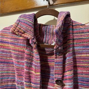 It’s cotton and rayon, buttons up, and has two front pockets.