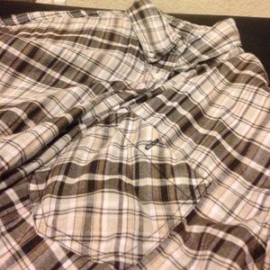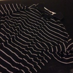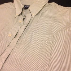 5 shirts collared and button down besides last shirt. Big black stripes with small white stripes is XL brand George. Light green and white stripes XL by Dockers. Darker plaid is L by BTC. Blue plaid has no tag say it fits XL. Small black and white stripes black collar L by Axcess this shirt has buttons up by collar but not going down.