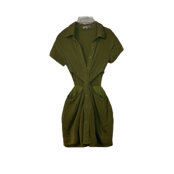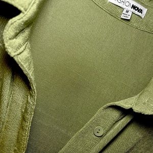 olive green ruched shirt dress, collared v-neck line, button down with flared bottom. perfect for casual day out, it’s not skin tight & not too loose.