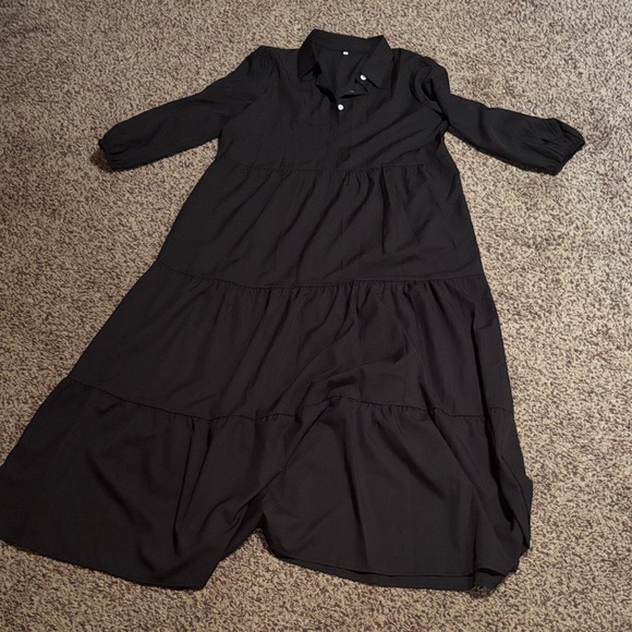 This elegant black maxi dress is perfect for any occasion. Its timeless design and comfortable fit make it a wardrobe essential. Size medium.