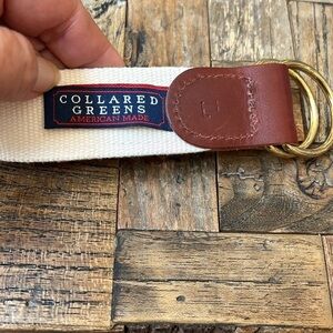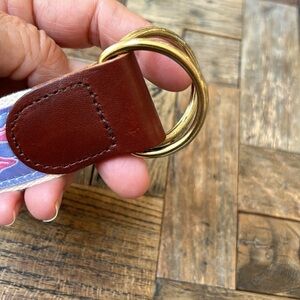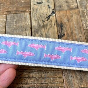 Collared Greens Kids Belt. Blue with pink fish. Leather & gold buckle closure. Collared Greens is based out of Charleston, SC and their products are American made. Excellent condition