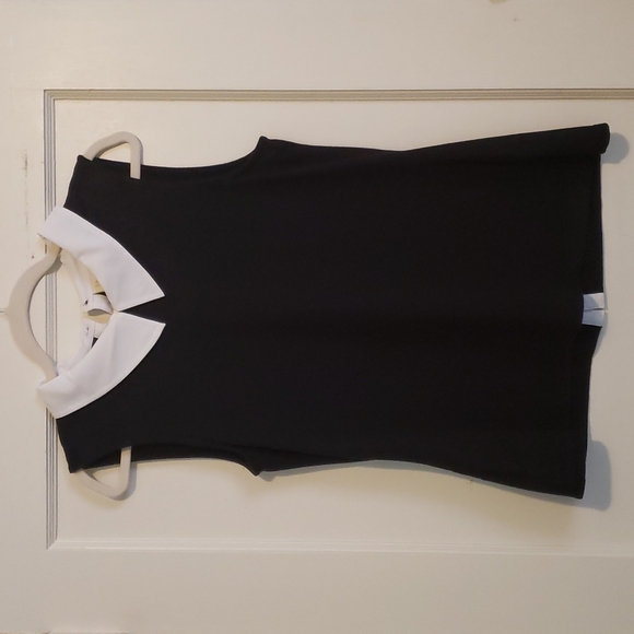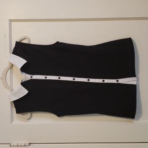 Knit shell tank in black color with white pointed. Button back details. Soft and stretchy material provides warm layer for business and/or casual occasions.