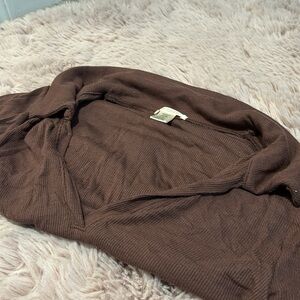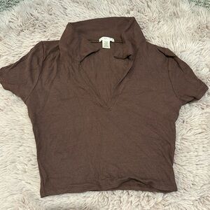 Brown ribbed collared crop, soft and flattering to wear. Low neck, but looks great with a bra.