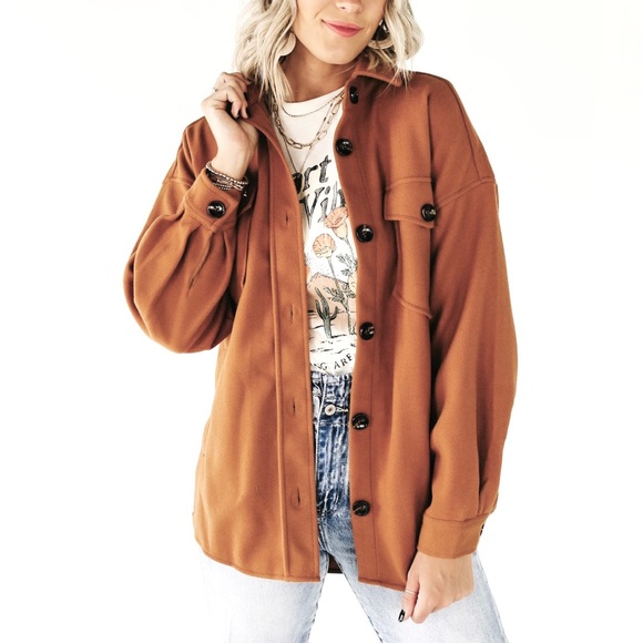 Shirt Jacket with collared neckline, full-length button-down closure, functional front pockets, and an oversized fit. Size S. Never worn except for photo.