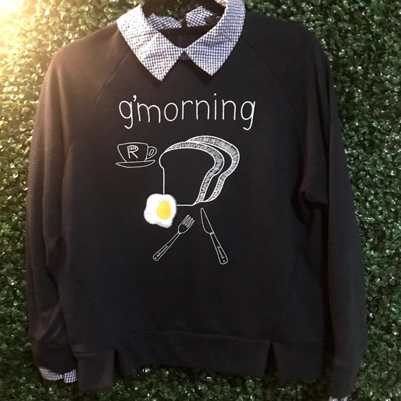 Cute collared sweater with breakfast foods and the words "g'morning" on it. Collar zips up neck on back.