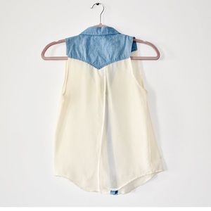 Sheer collared ivory and Denim tank with buttons down the front and an open back.